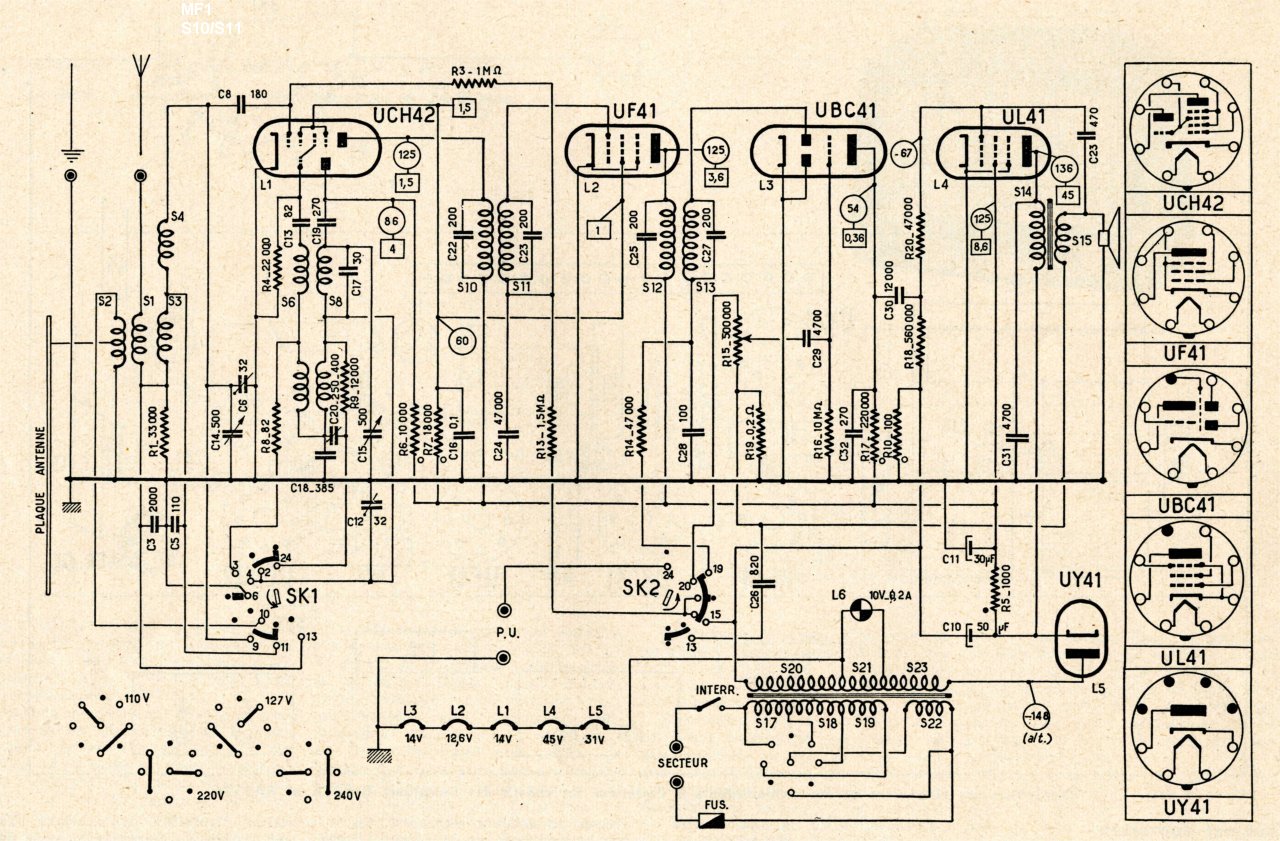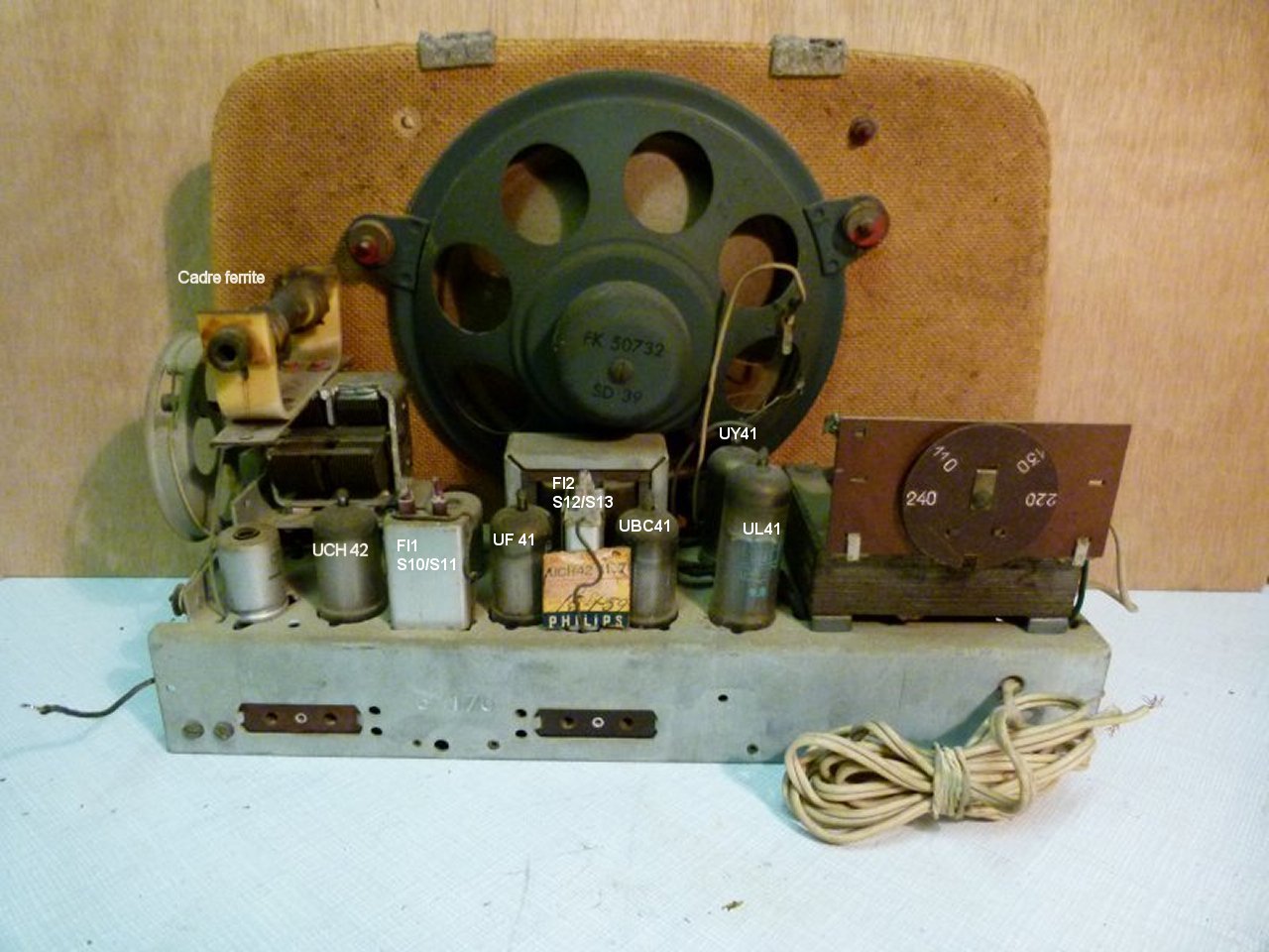 Le son semble être de meilleure qualité, plus clair, moins distordu, par contre la sensibilité ne s'est pas améliorée. peut-être qu'une lampe faiblarde est en cause? Je décide de tester la partie BF : en injectant la sortie écouteur d'un lecteur de CD sur l'entrée PU, le son sort fort et clair du haut-parleur. La panne se situe certainement en amont des UBC41 et UL41, soit la UCH42 ou la UF41. Je change la UCH42 par une autre usagée, pas d'amélioration notable. Je remets celle d'origine et je change la UF41 par une neuve. après quelques secondes de chauffe, le poste se remet à crier. En balayant le cadran, je constate que la sensibilité s'est grandement améliorée, à tel point que sur les GO toutes les stations sont reçues y compris la BBC ! j'ai toujours la même satisfaction à revoir fonctionner un appareil resté muet pendant de nombreuses années ! Après une heure, le fonctionnement est toujours satisfaisant. A l'aide du schéma, je contrôle quelques tensions aux bornes des tubes pour vérifier que leur polarisation est correcte. les tests sont concluants, encore un de sauvé! Après la technique,