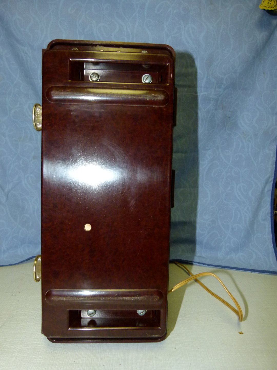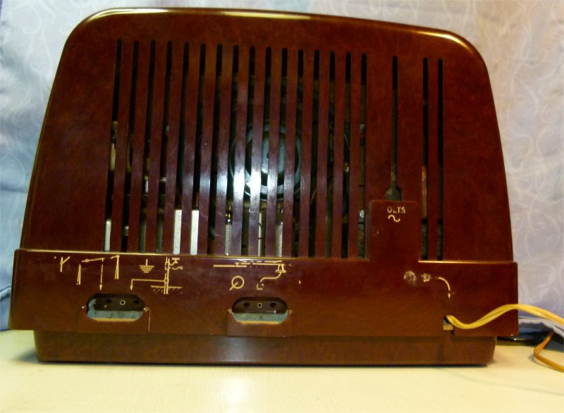 a disparu. A l'arrière de l'appareil, on découvre 2 prises repérées par des pictogrammes partiellements effacés :au centre on devine un bras de tourne-disque, ce sont les 2 bornes de l'entrée Pick-Up. A gauche, une borne est repérée par un sigle représentant 2 poteaux reliés par un cable, c'est l'accès antenne. A côté , un robinet fixé sur un tuyau symbolise la prise de terre (On retrouve ces dessins sur de nombreux Philips de cette époque). Ces deux bornes sont également repérées par les sigles normalisés : antenne,