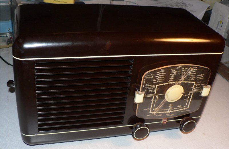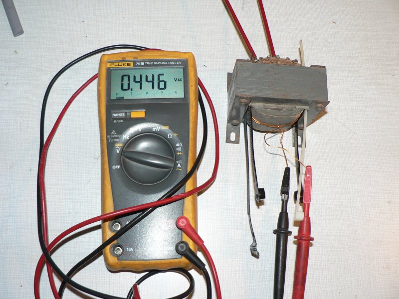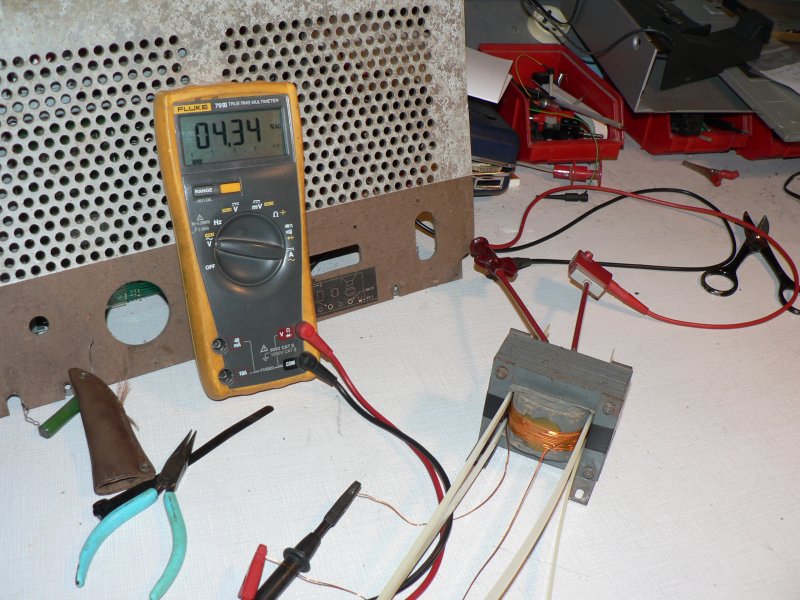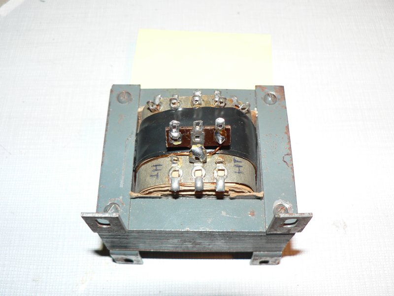 Un relais à 3 cosses soudé sur un plot de l’enroulement HT (celui qui va à la masse) permet de raccorder les 2 extrémités du bobinage (voir photo 4). Je charge l’enroulement avec une résistance de 3,6Ohms 8W et reconnecte le transfo au secteur, le voltmètre indique 4.1V avec un courant d’environ 1.15A, le test est concluant. Je remonte le transformateur dans le poste. Après une révision classique et la pose d’une AZ1 en bon état, le poste se met à chanter… Encore un de sauvé !!